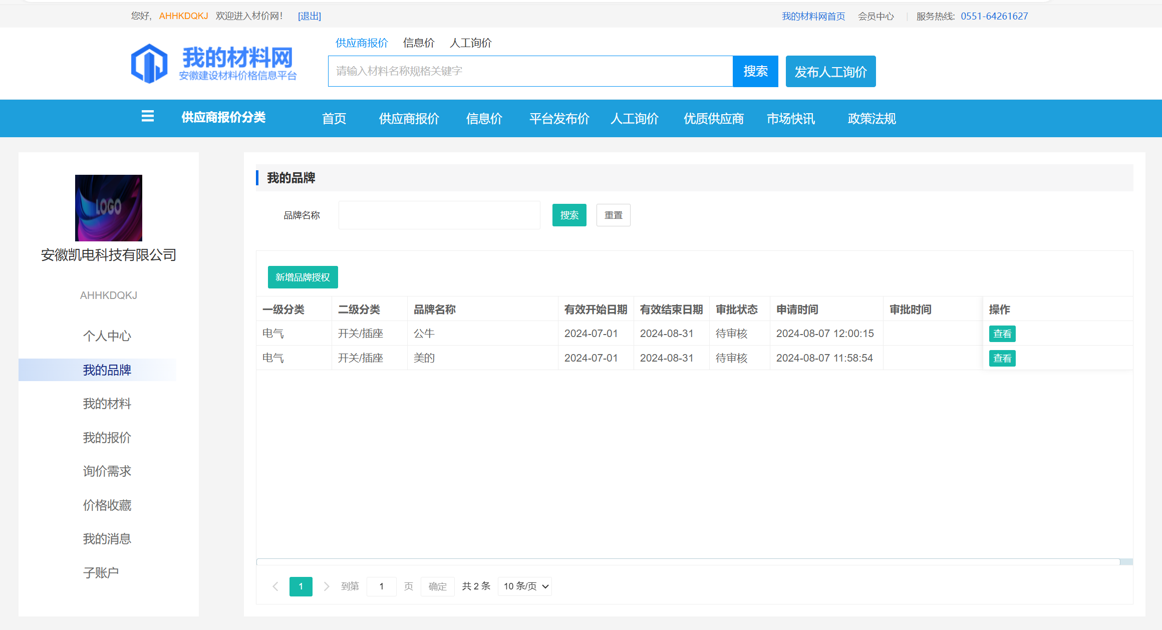 一、新增我的品牌,新增品牌授权如果出现提示信息为‘企业认证未通过,无法进行此操作’请返回个人中心完善企业信息提交企业认证,企业认证后才能新增我的品牌信息
