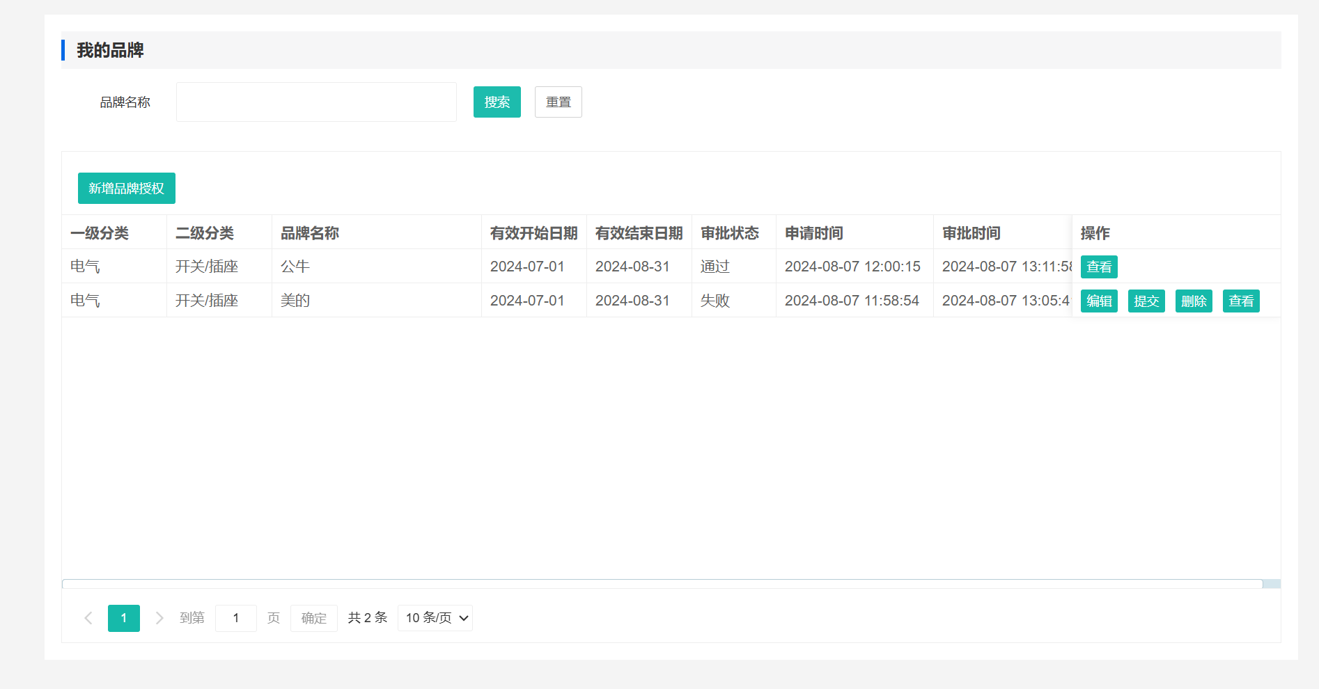 二、协会管理人员审核失败的品牌,供应商可以对其删除、编辑、重新提交申请操作。点击编辑功能可以修改品牌信息。点击提交,会再次发起申请审批功能,等待协会管理人员处理。点击删除后,数据不可恢复