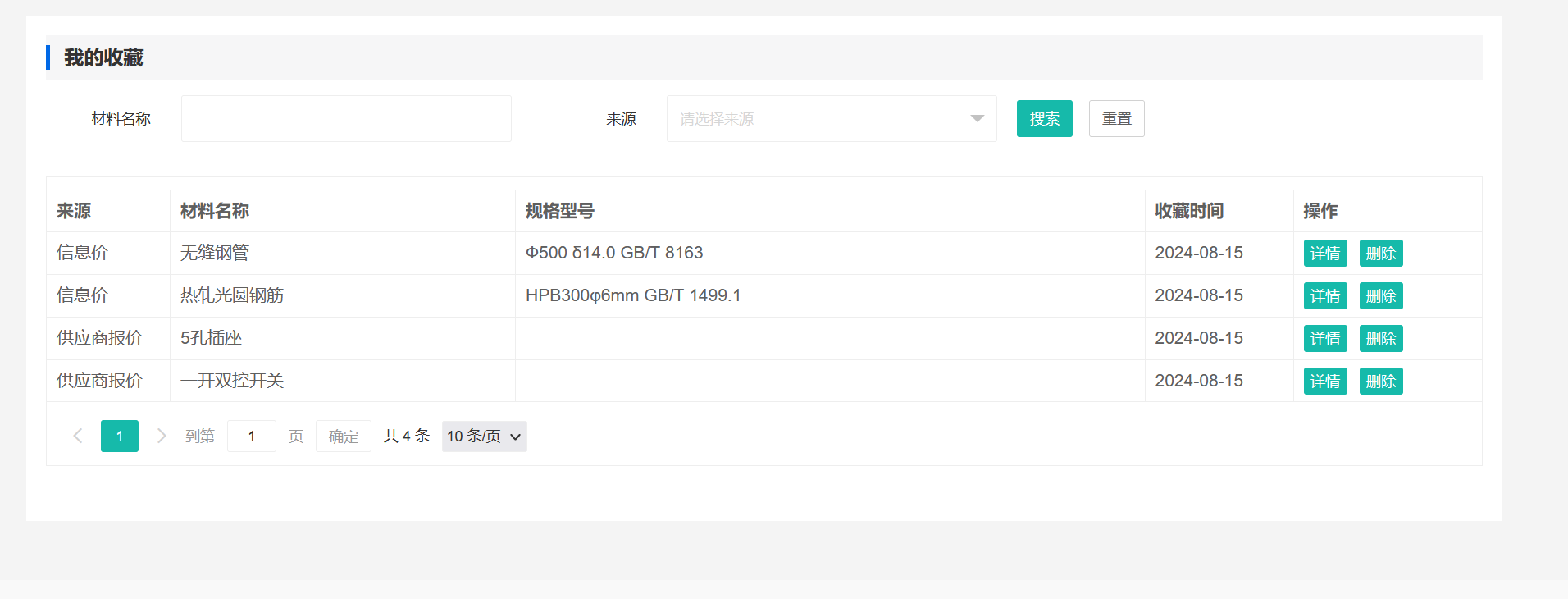 会员中心->价格收藏,在供应商报价、信息价、人工询价,点击列表右侧星状按钮,对需要的价格进行收藏;当前账户收藏的价格显示在下方列表;