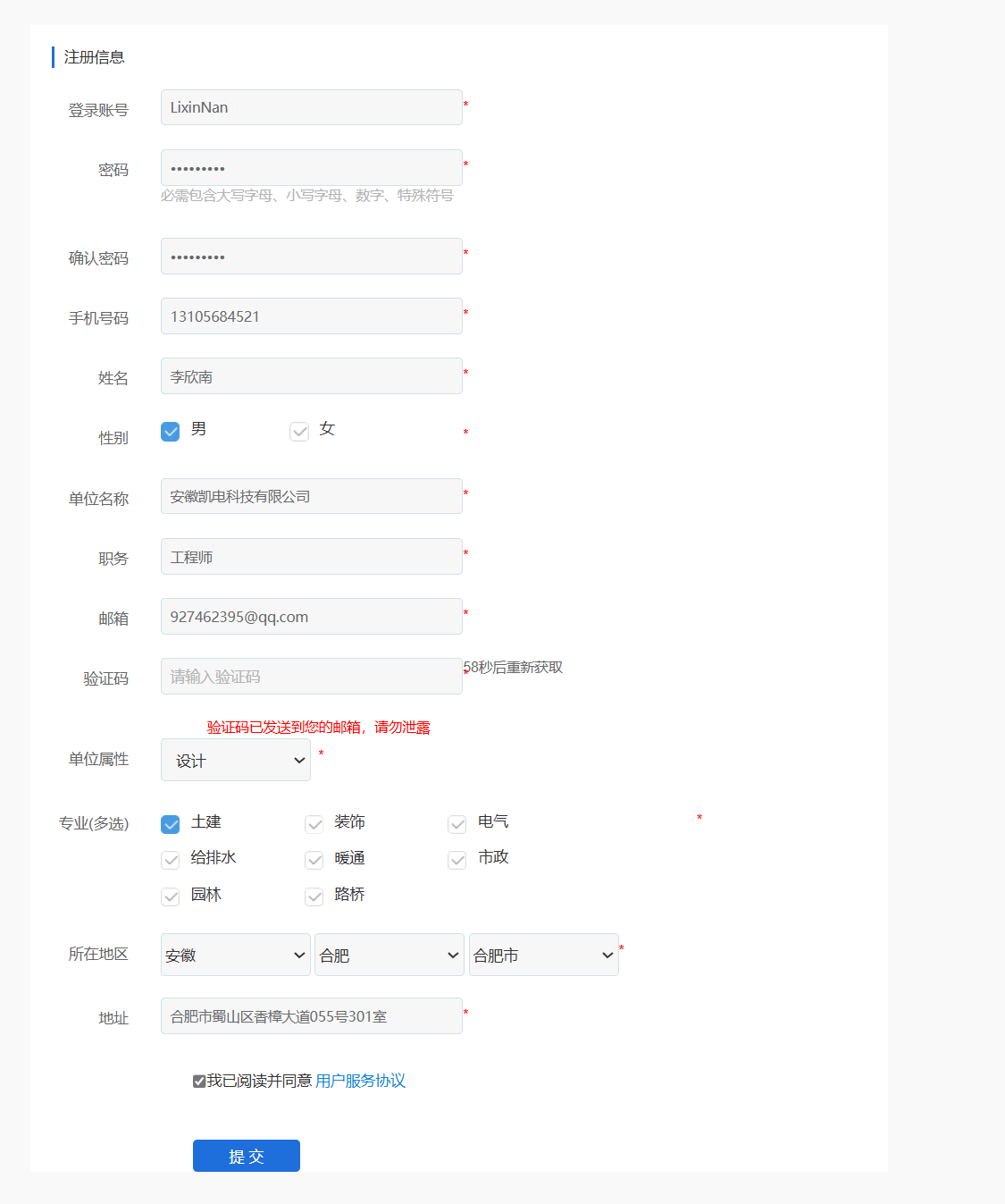 二、填写注册信息,为了账户安全,有关邮箱验证码不能轻易泄露,填写完数据后需要查看用户服务协议并勾选,注意:注册时,带有