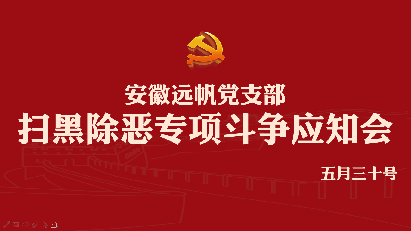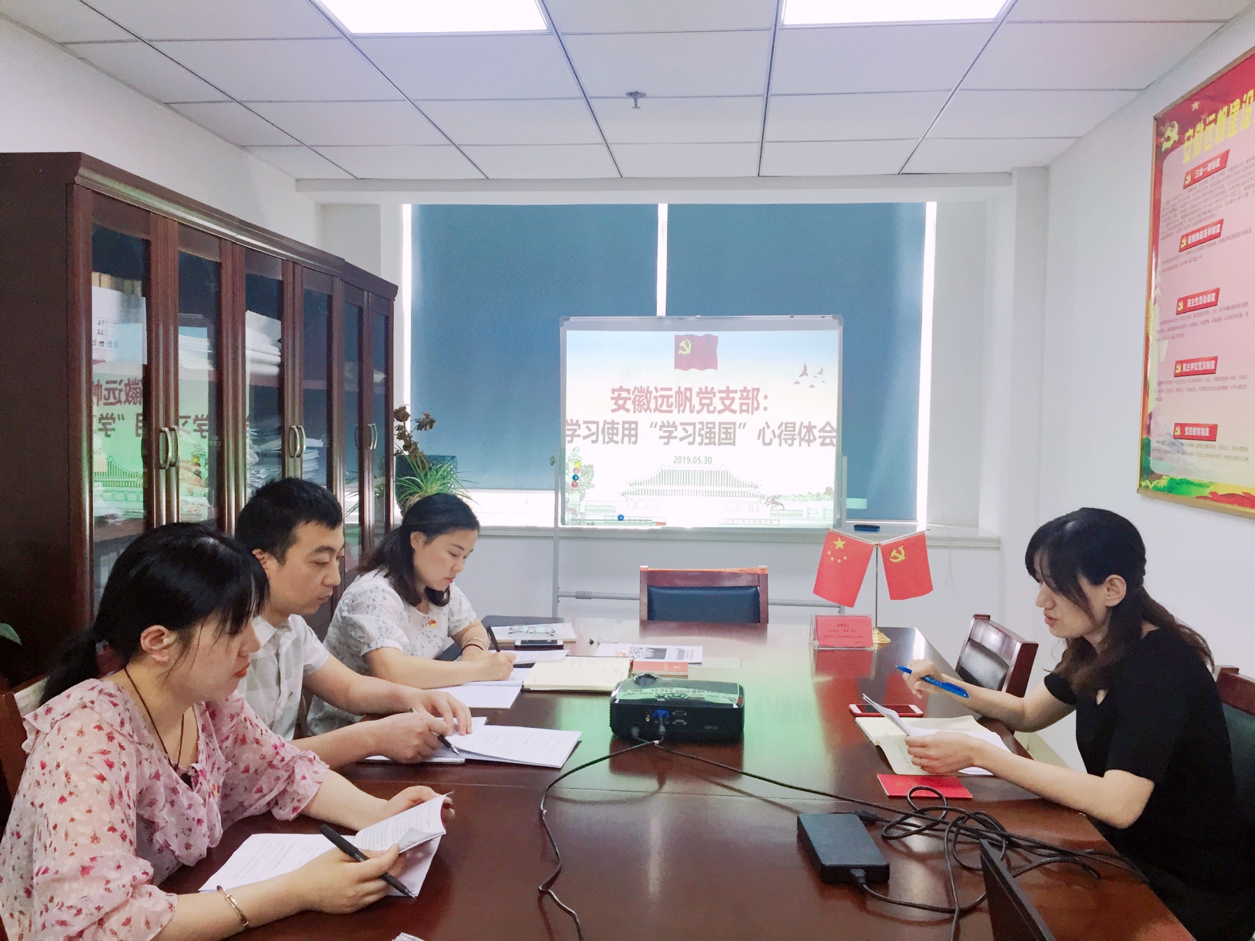 安徽远帆党支部于2019年5月30日下午召开了党员大会。会议分为三项议程,第一项议程为学习使用“学习强国”心得分享会,第二项议程为观看《中国共产党支部工作条例知识解读》视频,第三项议程为扫黑除恶专项斗争应知会活动。会议由刘玲玲同志主持。
