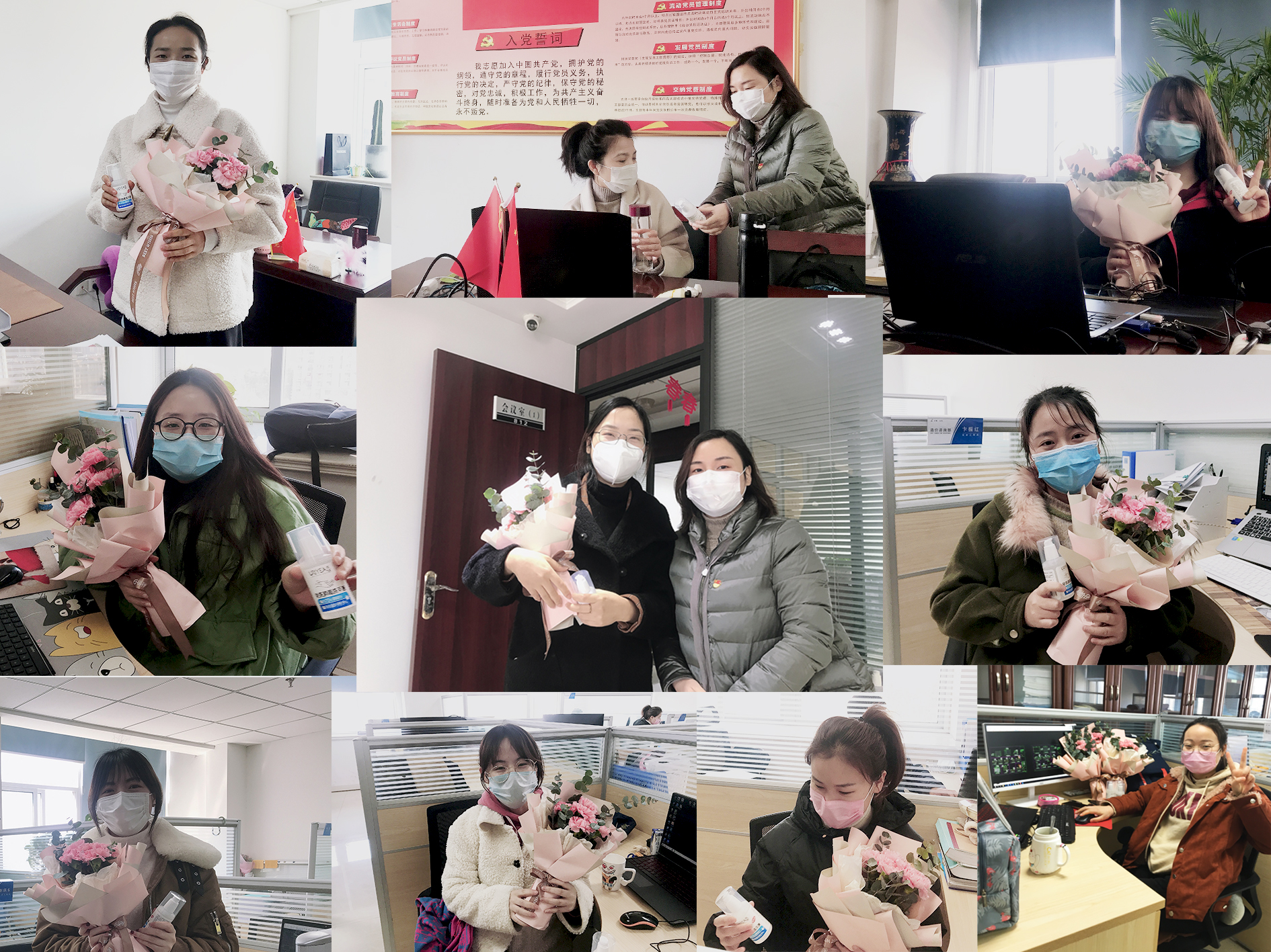 2020年才刚开始,似乎全世界都在提醒着我们要珍惜。疫情之下,一切似乎都被按了暂停键。然而,我们“隔离病毒,不隔离爱”。 2020年3月5日,在确保安全的前提下,安徽远帆党支部准备的一份女生专属surprise悄然而至!安徽远帆党支部纪检员刘玲玲、造价咨询部主任徐洁亲自为大家送上礼物。贴心的便携酒精洗手液、满满仪式感的鲜花、欢愉的气氛让我们忘却了一切不美好,仿佛看到口罩下的笑靥如花。