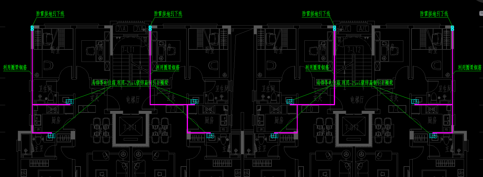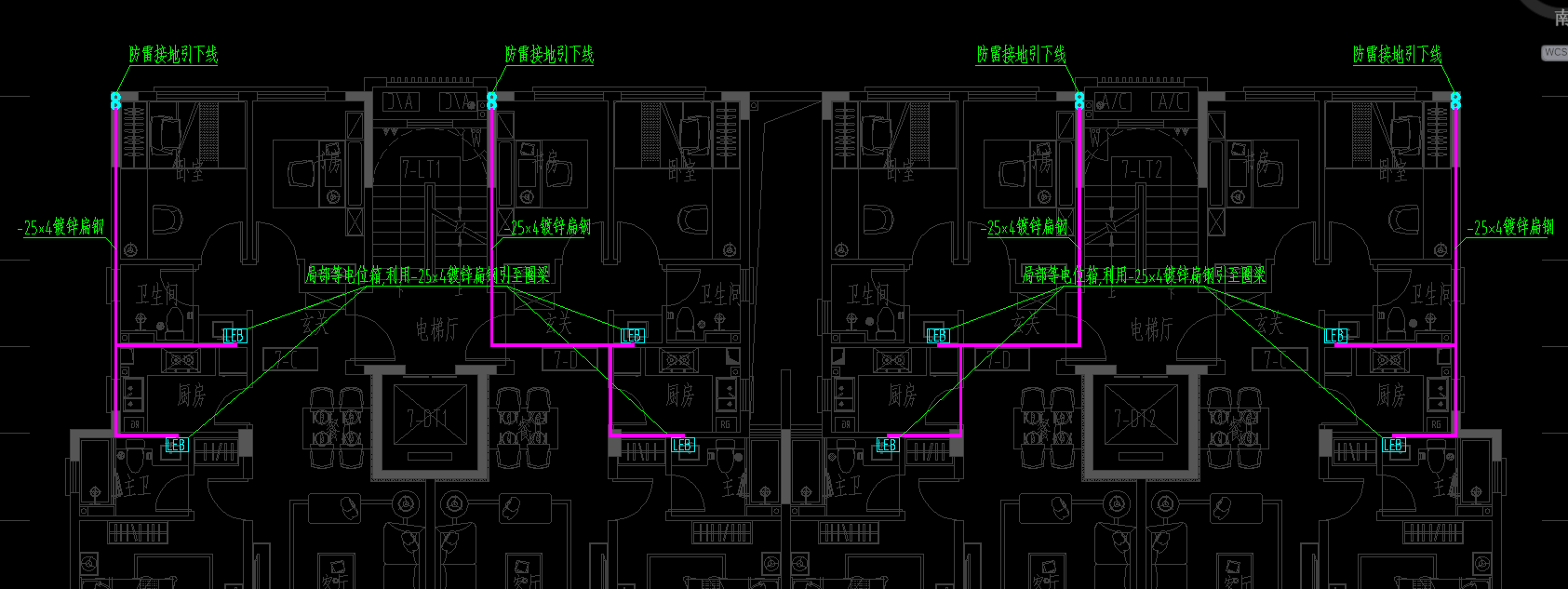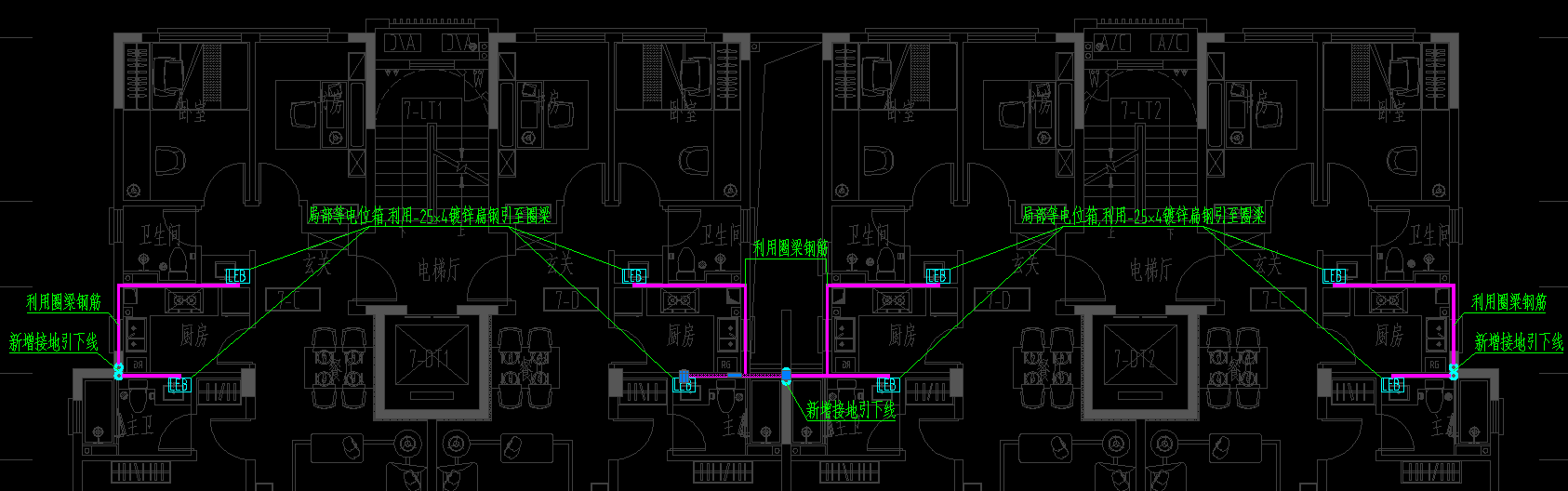 卫生间局部等电位(LEB箱)利用-25*4镀锌扁钢接地母线沿圈梁连接至设计防雷接地引下线位置,利用防雷接地引下线引下至接地体,平均每户涉及-25*4镀锌扁钢接地母线工程量12.7m,涉及造价260.54元/户,共涉及造价约19.02万元;