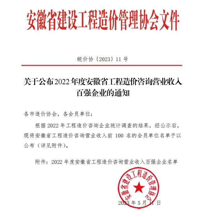 近日,安徽省建设工程造价管理协会发布了《2022年度安徽省工程造价咨询营业收入百强企业名单》,热烈祝贺远帆咨询公司位居第二十名!