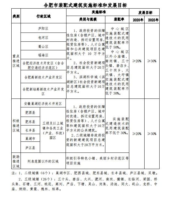 重点推进区域和积极推进区域的二级城镇,非政府投资的新建项目总建筑面积大于20万平方米的,应采用装配式建造技术。滨湖科学城(滨湖新区)新建项目总建筑面积大于10万平方米的,应采用装配式建造技术。鼓励各类建设项目积极采用装配式建造技术。